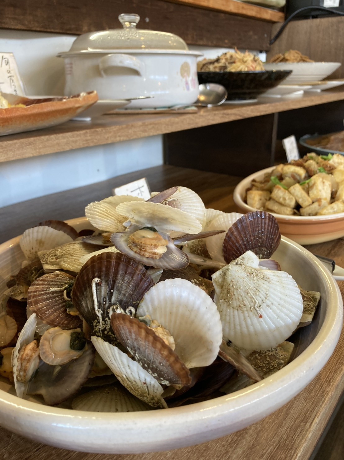 おばんざいにお出ししているサロマの美味しい稚貝の白ワイン蒸しも好評です!