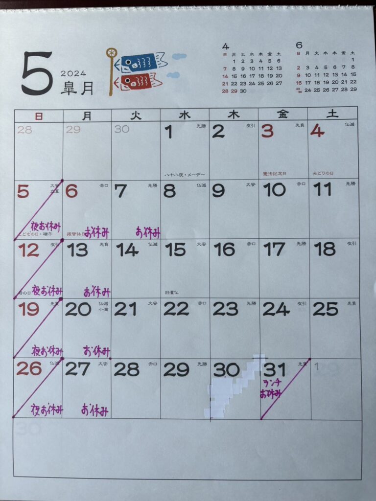 お知らせ 未分類 5月のお休みとなります5/5(日)夜の営業5/6 (月) 5/7(火)とお休みとなります。ご迷惑おかけ致しますがご理解の程よろしくお願い致します。 本日4/29(月)ランチのみの営業です。ご来店お待ちしております。
