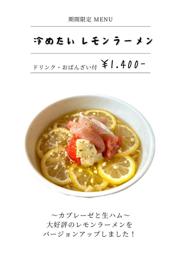 期間限定メニュー 未分類 6月からの期間限定メニューです。去年人気だった「レモンラーメン」バージョンアップしてのご提供になります。 「ヒレカツデミスパ」は賄い料理の人気メニューです!ぜひよろしくお願い致します。