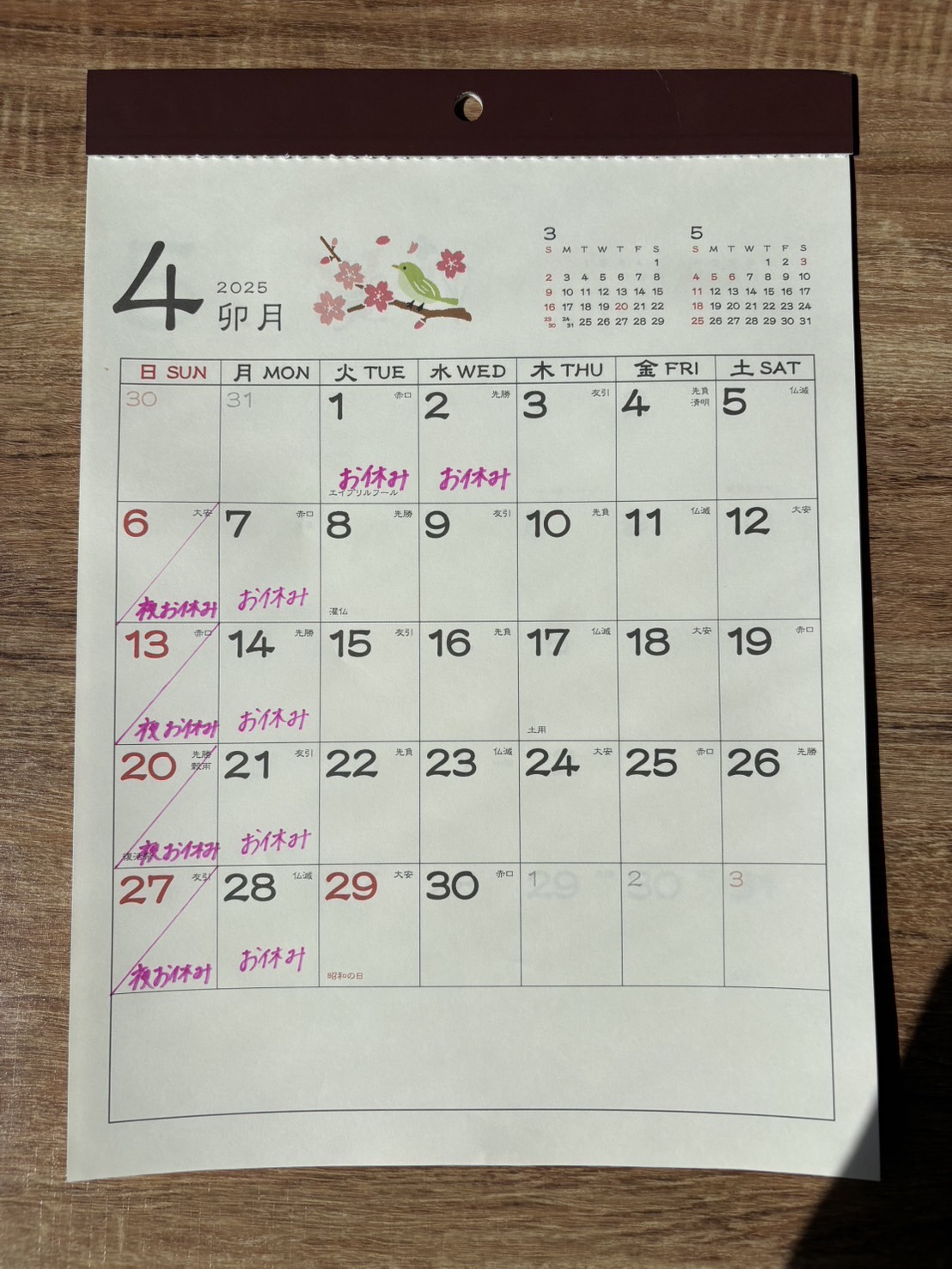 明日3/30〜4/2(水)までお休みさせて頂きます。
