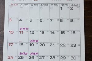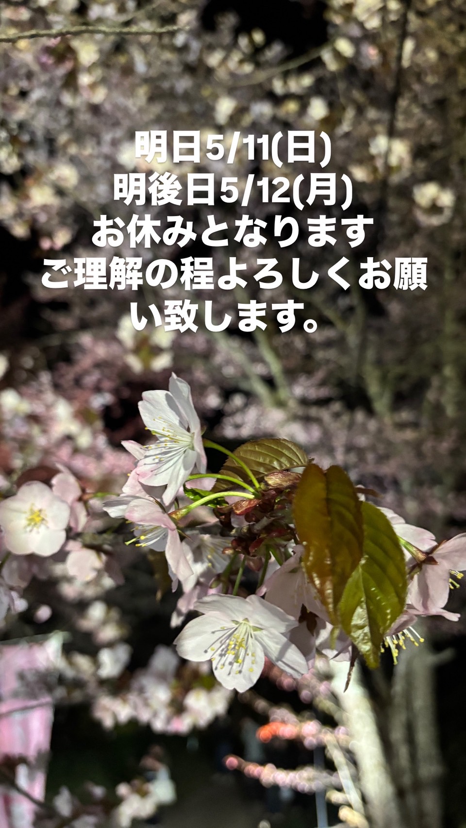 明日5/11(日) 明後日5/12(月) お休みとなります。 ご理解の程よろしくお願い致します。
