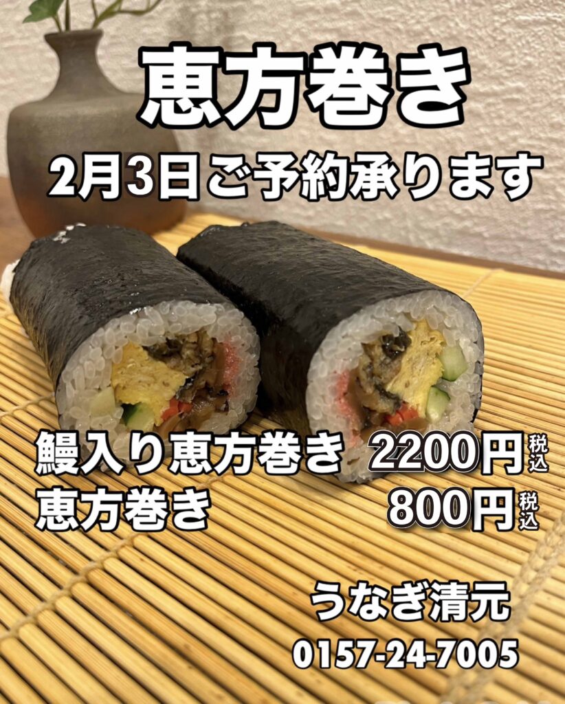 恵方巻き2月3日ご予約承ります。●鰻入り恵方巻き 2,200円税込●恵方巻き 800円税込